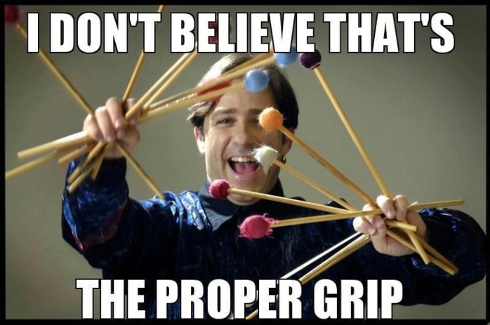 DISCLAIMER: All this talk about relaxing the grip may have some thinking that we should have spaghetti noodles for hands when holding a stick. This is absolutely not the case. The phrase we use at DOA for describing the grip is “firm yet relaxed.” This means that the hand should be relaxed enough to allow for good resonance of the stick, but still be firm enough to allow for an accurate stroke and not have and sticks fall out of hands. So don’t death grip your sticks/mallets; get a pretty firm grip on it and then… LET THE STICK BREATHE!